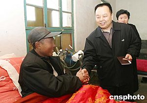二月十九日,作為河南省駐艾滋病疫情高發村幫扶工作組成員的陳瑞軍,在上蔡縣文樓村同艾滋病人握手。陳瑞軍是河南省衛生廳疾控處調研員,在今后的一年中他將和艾滋病患者同吃同住,為他們的衣食住行和疾病提供救助和救治。作者:慎重