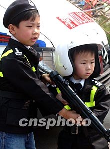 香港西區警區聯同中西區滅罪行委員會,二月二十二日舉行滅罪跑嘉年華活動,該活動的目的是透過有益的活動宣傳滅罪訊息并推廣健康生活,圖為兩位小朋友對展示的警務器械頗感興趣。中新社記者:錢興強