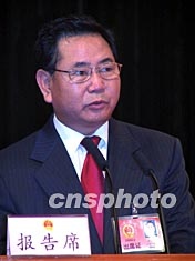 海南省三屆人大二次會議二月二十四至二十八日在?谂e行,會議將選舉產(chǎn)生省長。圖為代省長衛(wèi)留成在會上作政府工作報(bào)告。作者:王辛莉