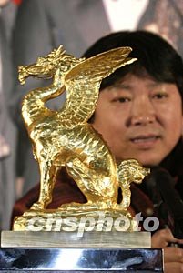 二月二十四日,獲得東京電影節(jié)“金麒麟”大獎的國產(chǎn)影片《暖》舉行媒體看片會,這部影片近期將在北京新開辟的藝術(shù)精品院線上映。圖為出席看片會的導(dǎo)演霍建起和金麒麟大獎。作者:高遠