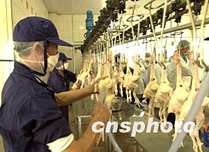澳門特區(qū)民政總署和珠海出入境檢驗(yàn)檢疫局一日在珠海舉行會(huì)議,就恢復(fù)因禽流感而中斷的活雞輸入問題進(jìn)行協(xié)商并達(dá)成共識(shí),雙方?jīng)Q定報(bào)國(guó)家有關(guān)部門批準(zhǔn)后,從三月五日起同步恢復(fù)活雞、冰鮮雞、和凍雞的供應(yīng)。圖為在為澳門進(jìn)行活雞加工的珠?铺┯邢薰拘笄菔称窂S的活雞加工生產(chǎn)在線,工人們對(duì)宰殺后的雞只進(jìn)行認(rèn)真的清洗。中新社傳真 李剛 攝