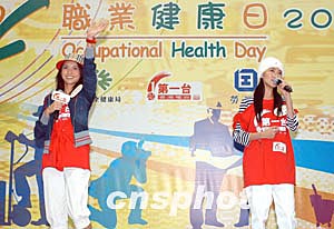 歌星何韻詩3月6日在香港出席由職安局及勞工處舉辦之《職安健康日2004》開幕典禮活動,「職安領隊」何韻詩帶領出席嘉賓及歌星進行健康操,宣揚職業安全信息。作者:鄧慶樂