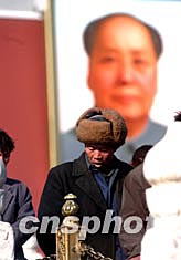 圖為一位農民于三月份第一個周末在北京天安門前參觀游覽。中國國家總理溫家寶在日前所作的政府工作報告中有關“一年降低一個百分點,五年內取消農業稅”的承諾,為全中國的農民所矚目和期待。中新社記者:武仲林
