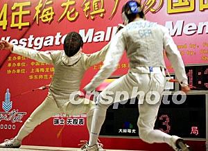 三月八日,中國“劍客”董兆致(左)在上海梅龍鎮廣場舉行的二○○四國際劍聯男女花劍世界杯大獎賽男子個人花劍決賽中,擊敗德國的Bissdorf Ralf獲得冠軍。作者:湯彥俊