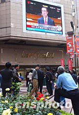 三月十日,香港特區政府財政司司長唐英年在立法會提交二零零四至零五年度財政預算案,圖為許多市民在時代廣場大屏幕前駐足聆聽。作者:潘索菲
