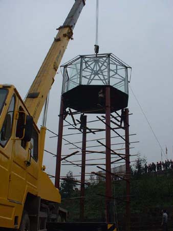 2∶45,三位雅安市公證處的公證人員對陳建民的隨身物品進行了嚴格的檢查,在確定沒有任何違背挑戰活動承諾的物品后,陳建民才被吊車送進了14米高的玻璃房。