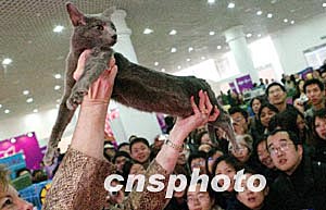 2004年3月21日是世界名貓盛會亮相上海最后一天,當天舉行了許多單體項目的比賽,近120多只來自中國各地的名貓角逐“中國貓王”,最終新一屆的“貓王”頭銜被一只金吉拉摘走。中新社傳真 楊磊攝