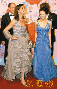 席上,章子怡獲阿爾伯特王子(Prince Albert)垂青,兩人不時以英語交談,共舞一曲。章子怡當晚戴上總值500萬港元的耳環(huán)和手鐲,穿著一襲藍色性感晚裝,明艷照人,與嘉露蓮(Princess Caroline of Hanover)公主爭妍斗麗。