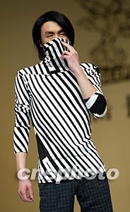 EAGLEPTY休閑裝發(fā)布會三月三十一日在北京國際時(shí)裝周上舉行,模特展示一款設(shè)計(jì)簡練卻充滿前衛(wèi)風(fēng)格的設(shè)計(jì)。中新社記者:毛建軍