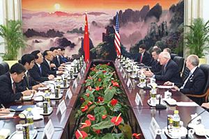 曾慶紅對切尼來華訪問表示歡迎。他說,中美都是偉大的國家,兩國存在分歧,但共同利益是第一位的。無論是在維護亞太地區和世界的和平穩定,推動地區和全球經濟發展,還是在應對恐怖主義、武器擴散、跨國犯罪和疾病等方面,我們兩國都擁有廣泛的共同利益和合作基礎,中方對近年來兩國關系取得的進展感到高興,愿與美方共同推動中美建設性合作關系繼續向前發展。