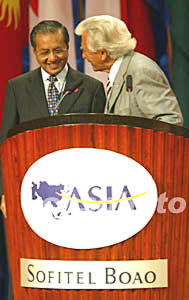 四月二十四日,馬來西亞前總理馬哈蒂爾(左)在博鰲論壇領導人峰會上發(fā)表演講后,在主持人霍克的要求下接受現(xiàn)場提問。中新社記者:鄭萍萍