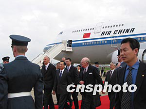 中新社倫敦五月九日電 (記者 朱大強)當地時間今天上午十時五十分,中國國務院總理溫家寶乘專機抵達倫敦希思羅機場,開始對英國進行為期三天的正式訪問。