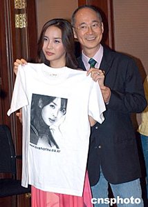 香港唯美派導演楊凡與韓國影星河利秀展示該片宣傳T恤。作者:鄧慶樂