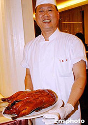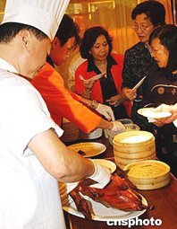 香港全聚德飯店五月十二日正式開幕,這里烤制的正宗掛爐烤鴨,令香港市民又多一處品嘗北京百年老字號全聚德烤鴨的新去處。作者:錢興強