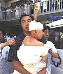 北京大學(xué)第一醫(yī)院幼兒園十五名兒童和三名教師二00四年八月四日上午九時(shí)左右在幼兒園被人持菜刀砍傷。其中一名重傷兒童經(jīng)搶救無(wú)效死亡。犯罪嫌疑人是該幼兒園一名五十一歲的臨時(shí)工。北京警方透露,兇嫌有精神病史