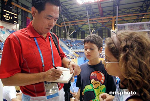 雅典奧運(yùn)會乒乓球比賽期間,坐在觀眾席上觀戰(zhàn)的中國乒乓球總教練蔡振華成了外國小球迷追逐的明星。中新社記者:張煒