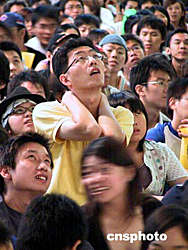 中國臺北隊在雅典奧運會棒球賽中3:4惜敗日本隊,臺北球迷為之惋惜。中新社記者:曾嘉