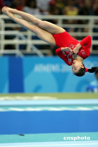 雅典奧運會體操比賽當地時間八月二十三日結束,被寄予厚望的中國隊失誤頻頻,成績出人意料。十六歲湖北女孩程菲在自由體操決賽中動作難度雖然較大,但由于缺乏藝術感染力而失分不少,結果名列第四。中新社記者:任晨鳴