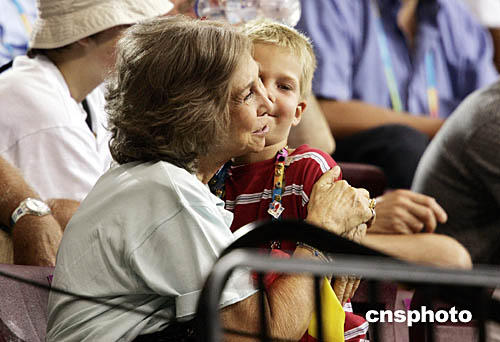 圖為西班牙皇后索菲亞與她的孫子在觀看西班牙隊和德國隊的手球比賽。