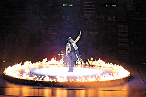 華仔前晚的個(gè)唱以爆發(fā)大型火圈作揭幕,他站在升高的舞臺(tái)上,舉手點(diǎn)起舞臺(tái)之火;紅館立時(shí)出現(xiàn)一個(gè)直徑廿一尺之大火圈,把他團(tuán)團(tuán)圍著,他就在這個(gè)大火圈之中,配合舞臺(tái)機(jī)關(guān),突然現(xiàn)身又突然隱形,有如大衛(wèi)高柏飛般表演魔法。而華仔在紅館所引發(fā)的舞臺(tái)圣火,同時(shí)是“紅館”有史以來燃點(diǎn)最大的火特技,為了引發(fā)這一場(chǎng)效果,他個(gè)多月前親身到清水舞臺(tái)日本基地試火;舞臺(tái)運(yùn)來香港后,也經(jīng)過紅館多番審核,由引火的石油氣到表演時(shí)控制火勢(shì)大小,都要通過測(cè)試,大會(huì)一共經(jīng)過三次試火,才獲批準(zhǔn)表演。而舞臺(tái)下面亦藏有多罐石油氣體作燃料,“紅館”十分擔(dān)心安全問題,下令這個(gè)項(xiàng)目必定要在開幕進(jìn)行,免得演唱會(huì)兩個(gè)多小時(shí)內(nèi)臺(tái)底存放過多易燃物品,表演一旦完成,臺(tái)底的石油氣罐要馬上由工作人員移走到安全地點(diǎn),免生意外。