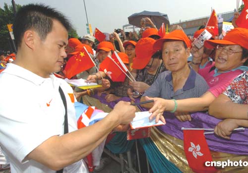 國家奧運金牌代表團9月7日在香港展開觀光之旅,在抵達灣仔金紫荊廣場參觀時,吸引大批市民圍觀,圖為舉重金牌選手張國政為熱情的香港市民簽名。作者:趙振清