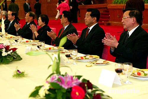 全國政協(xié)、中央統(tǒng)戰(zhàn)部九月二十八日在北京舉行招待會慶祝中華人民共和國成立五十五周年,全國政協(xié)主席賈慶林、國務(wù)委員唐家璇等出席招待會。中新社記者:滿會喬