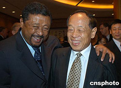 美東時間九月二十八日晚,中國常駐聯合國代表團舉行中華人民共和國成立五十五周年國慶招待會。五十九屆聯大主席、加蓬外長讓·平前往道賀。讓·平的父親程志平祖籍浙江溫州,母親是加蓬人。圖為讓·平與正在紐約聯合國總部參加一般性辯論的中國外長李肇星親切會面。作者:陳建