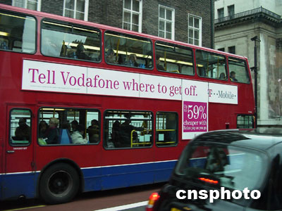 倫敦公交車車身上,赫然出現移動通訊運營商直接點名挑戰對手的廣告。余瑞冬 攝