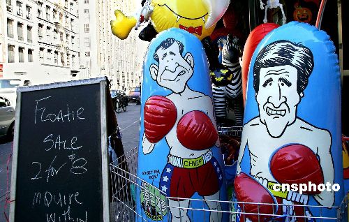 10月12日,印有布什、克里形象的拳擊氣囊在美國紐約街頭出售,顧客可以買來發泄“私憤”。Ic/cnsphoto 攝