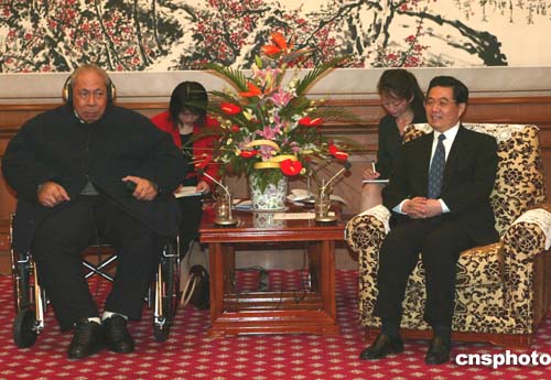 中新社北京十月十八日電(記者齊彬)中國國家主席胡錦濤今天下午在會見湯加國王圖普四世時表示,我們贊賞圖普四世國王為實現中湯關系正;鞒龅闹匾暙I,感謝湯加堅持一個中國政策、支持中國在臺灣問題上的正義立場。