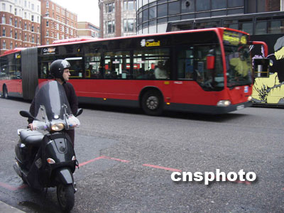 新的紅色雙節大公交車,在倫敦街道中快速穿行。余瑞冬 攝