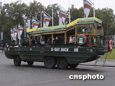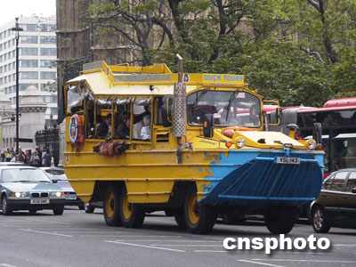 倫敦街頭造型模仿諾曼底戰役盟軍登陸艦的觀光大巴。余瑞冬 攝