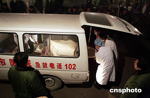 二零零四年十一月二十一日晚,經過連續搜索搶救,河北省邢臺市沙河礦難死亡人數又有所增加,又有十多名礦工的遺體被抬出金鼎鐵礦巷口。中新社記者:武仲林