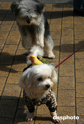 日本導盲犬電影《再見了,可魯》在臺灣上映首周,不僅票房突破三千萬新臺幣,而且在臺灣島內掀起一股“可魯熱”。圖為一只小狗在主人牽引下“馱”著兩只小鳥悠然漫步臺北街頭,還惹得一只貓咪湊近觀看。中新社記者:董會峰