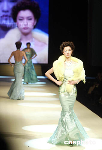 十一月二十五日,中國國際時裝周在北京中國大飯店舉行閉幕儀式,名模杜鵑在閉幕式上進行時裝展示表演白領品牌的晚裝。中國國際時裝周在一周的時間內,連續上演了三十多場專業時裝流行趨勢發布。作者:盛佳鵬