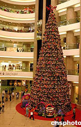 經濟持續向好,加上臨近圣誕節,香港大型商場均以大額宣傳費用,以增加人流,希望今年圣誕節業額有可觀收入。圖為時代廣場大堂裝飾紅紅火火的巨型圣誕樹,充滿圣誕氣氛。作者:譚達明