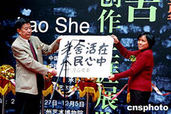 為紀念老舍先生誕辰一百零五周年,由中共廣州市委宣傳部、中國老舍研究會與中國現(xiàn)代文學館聯(lián)合舉辦的《老舍文學創(chuàng)作生涯展覽》十一月二十七日在廣州藝術博物院隆重開幕。著名漫畫家廖冰兄先生書寫的《老舍活在人民心中》賀詞由女兒廖凌兒代贈送給老舍先生之子舒乙教授。作者:劉衛(wèi)勇