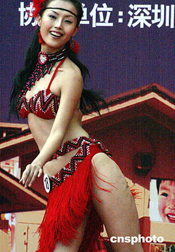 參加第十七屆世界模特小姐大賽中國賽區總決賽的選手,十月五日在深圳舉行大賽巡游時裝秀,圖為參賽佳麗表演熱情奔放的拉丁舞。中新社記者:錢興強