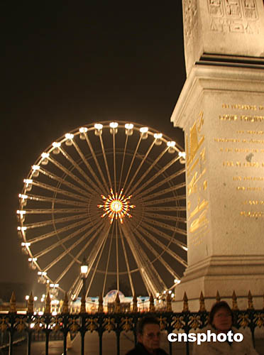 高四十米的巴黎摩天輪十二月中旬由當地一公園搬到巴黎市中心協和廣場,并將于十八日開始運行。據悉,新年除夕夜摩天輪將進行主題為“申辦2012年奧運會”的煙火表演。圖為協和廣場方尖碑旁正在調試中的巴黎摩天輪。作者:鐘誠
