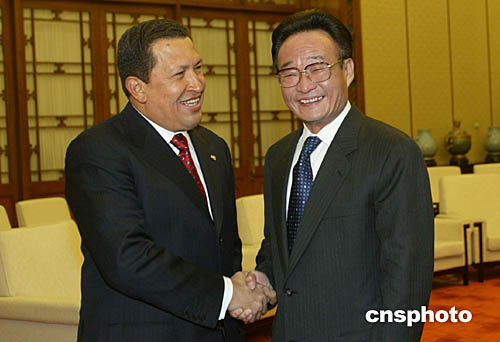 吳邦國說,兩國領導人交往對發展雙邊關系有重要意義。總統閣下第三次來訪正值中委建交三十周年的重要時刻,必將推動中委共同發展的戰略伙伴關系進一步發展。吳邦國感謝委內瑞拉堅持一個中國政策。