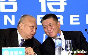香港特首董建華和澳門特首何厚鏵出席中外記者招待會。作者:陳文