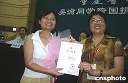 六月二十二日,重慶市紅十字會副會長周清梅向吳渝頒發骨髓捐獻證書。作為中國跨國捐獻骨髓第一人,來自重慶醫科大學的吳渝將于六月二十三日啟程前往北京采集造血干細胞。作者:郭晉嘉