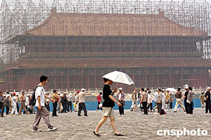 六月夏季,北京故宮博物院乾清門內西側系列旁殿腳手架林立,故宮百年大修工程正在進行之中。故宮于1420年建成,此次維修是自1911年辛亥革命以來近百年間,對故宮進行的最大規模的維修。中新社記者:鄒憲