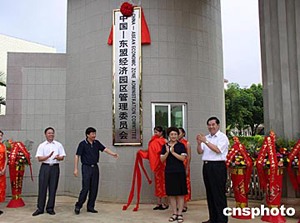 中國—東盟經濟園區七月七日在南寧華僑投資區揭牌,國務院僑辦副主任李海峰(右二)、廣西區副主席吳恒、廣西僑辦主任李漢金、南寧市長林國強等出席儀式。中國—東盟經濟園區將充分利用投資區內的人文優勢、土地優勢、政策優勢及區位優勢,吸引東盟國家企業前往廣西投資。作者:曹紅