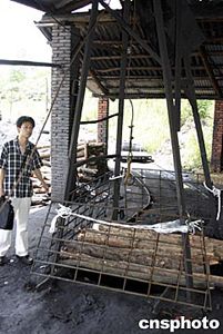 十四日七時,湖南湘潭雙扶煤礦系統進行提升時,因電纜折斷,造成電纜短路起火,導致井筒木支架起火燃燒,使當時正在井下作業的九十五人被困。現已確認有六人死亡,還有三人被困井下,下落不明。圖為發生礦難的井口。作者:白祖偕