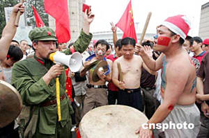 七月十七日,一名中國球迷身著解放軍舊式軍服,手舉“紅寶書”,和同伴一起祝愿中國足球隊在亞洲杯賽上取得好成績。二零零四年亞洲杯足球賽當晚在北京開幕。中新社記者:毛建軍