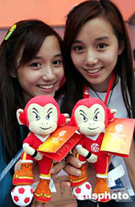 二零零四年亞洲杯足球賽七月十七日晚在北京工人體育場開幕,開幕式前,一對在北京廣播學院就讀的雙胞胎姐妹在場外推銷可愛的吉祥物猴子“貝貝”。中新社記者:毛建軍