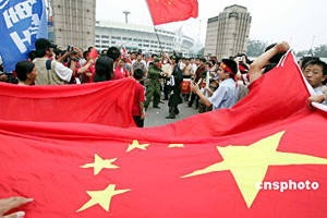 七月十七日,中國球迷在亞洲杯足球賽開幕式會場外吶喊,為亞洲杯首度在中國舉辦而喝彩。二零零四年亞洲杯足球賽當晚在北京開幕。中新社記者:毛建軍