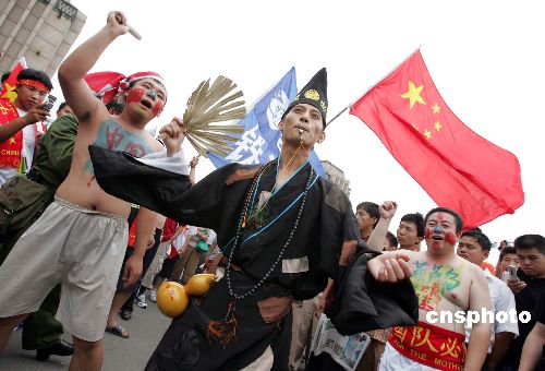 一名球迷十七日裝扮成“濟(jì)公”形象,在亞洲杯足球賽開(kāi)幕式會(huì)場(chǎng)外吶喊,為亞洲杯首度在中國(guó)舉辦而喝彩。二零零四年亞洲杯足球賽十七日晚在北京開(kāi)幕。作者:毛建軍