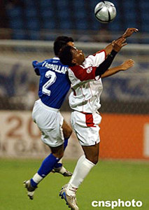 7月19日晚,2004年亞洲杯B組科威特隊與阿聯酋隊的比賽在濟南山東省體育中心開戰。科威特隊(藍)發揮出色,最終以3比1大勝阿聯酋隊。中新社記者:武仲林